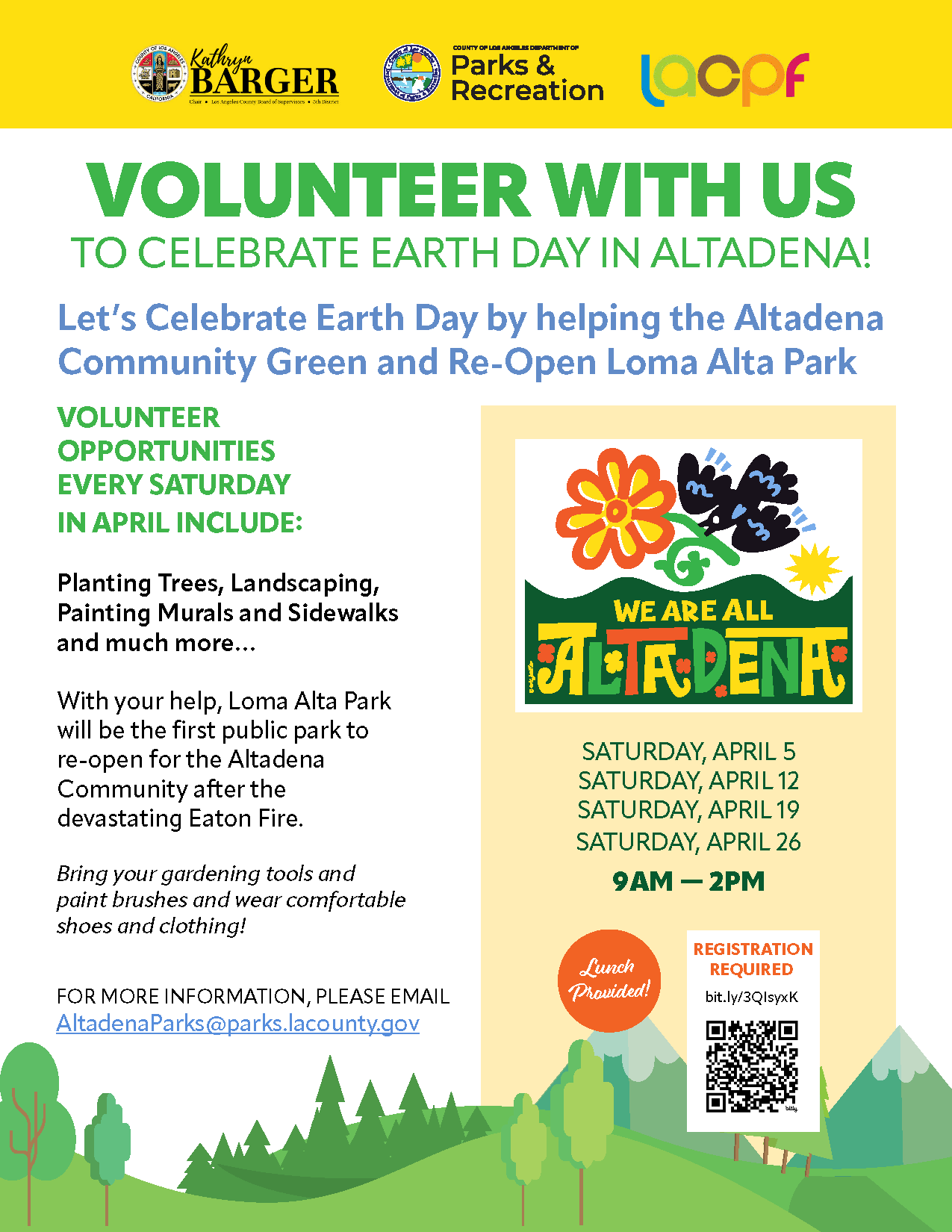 One of Altadena's parks that was damaged in the Eaton Fire is reopening! Loma Alta Park is looking for volunteers during the month of April to help with:
