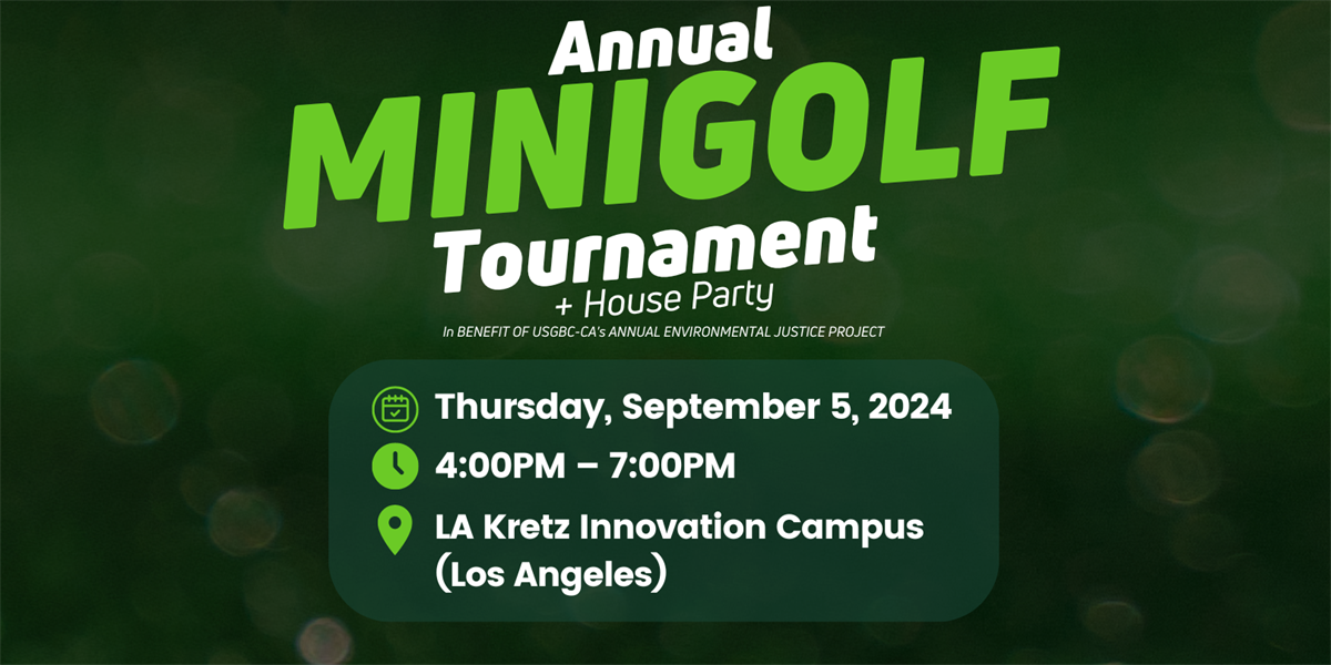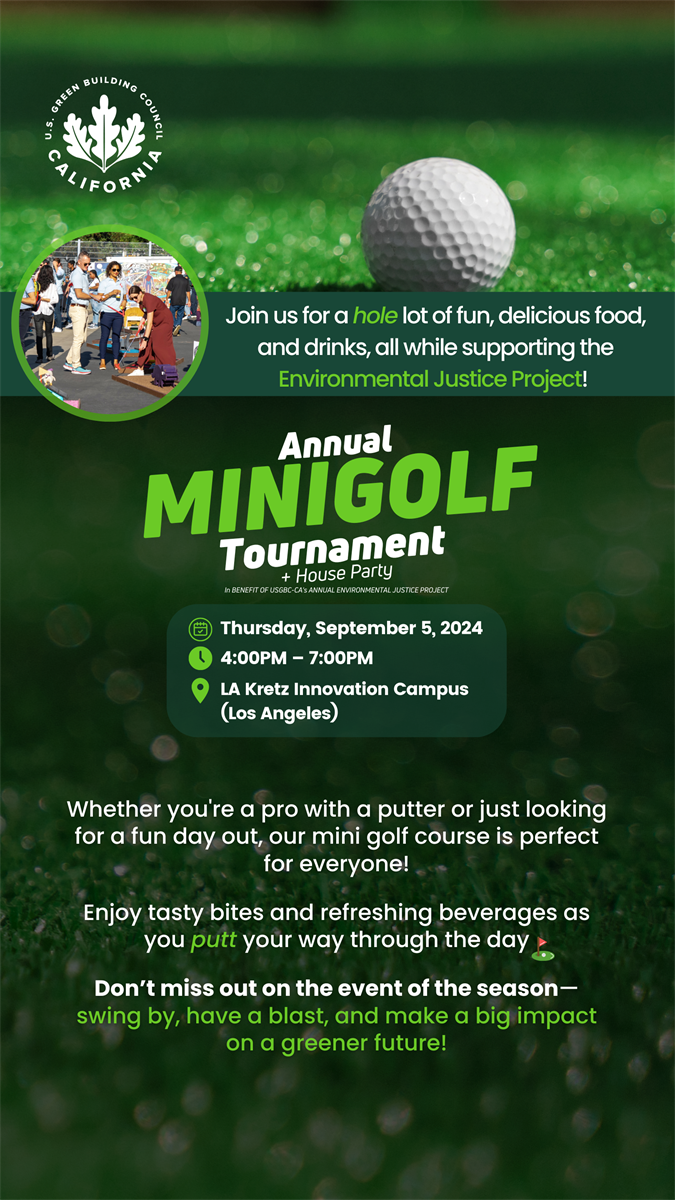 Join us at the La Kretz Innovation Campus for a hole lot of fun at @usgbcca’s Annual Mini Golf Tournament + House Party on Thursday, September 5! ⛳️ From 4pm-7pm, enjoy delicious food, drinks, and putting around the mini golf course, all while supporting USGBC-CA’s Environmental Justice Project (EJP)